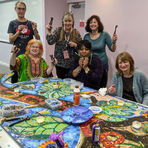 Through a number of workshops with regular members of Pepper Pot Over 60s Group, a design was discussed. As the members were mainly of Afro Carribean descent, dancing on the beach was a popular theme. The motif was inspired by record covers in the 1950s (Calypso music). Ongoing workshops continued where they made the mosaic sections together. Volunteers from the community helped to complete the mosaic which now hangs on the main lounge wall.