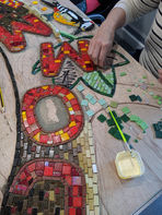 This project was instigated on a Heritage Event Day to celebrate 50 years of the Community Centre and its relationship to Sidings from the railway on which the site was located. This was followed by workshops with youth groups and art sessions who made the trees and the flowers. These were incoporated into the main mosaic which was completed in community workshops and finally by volunteers. It now hangs in the entrance area to this well-loved centre.